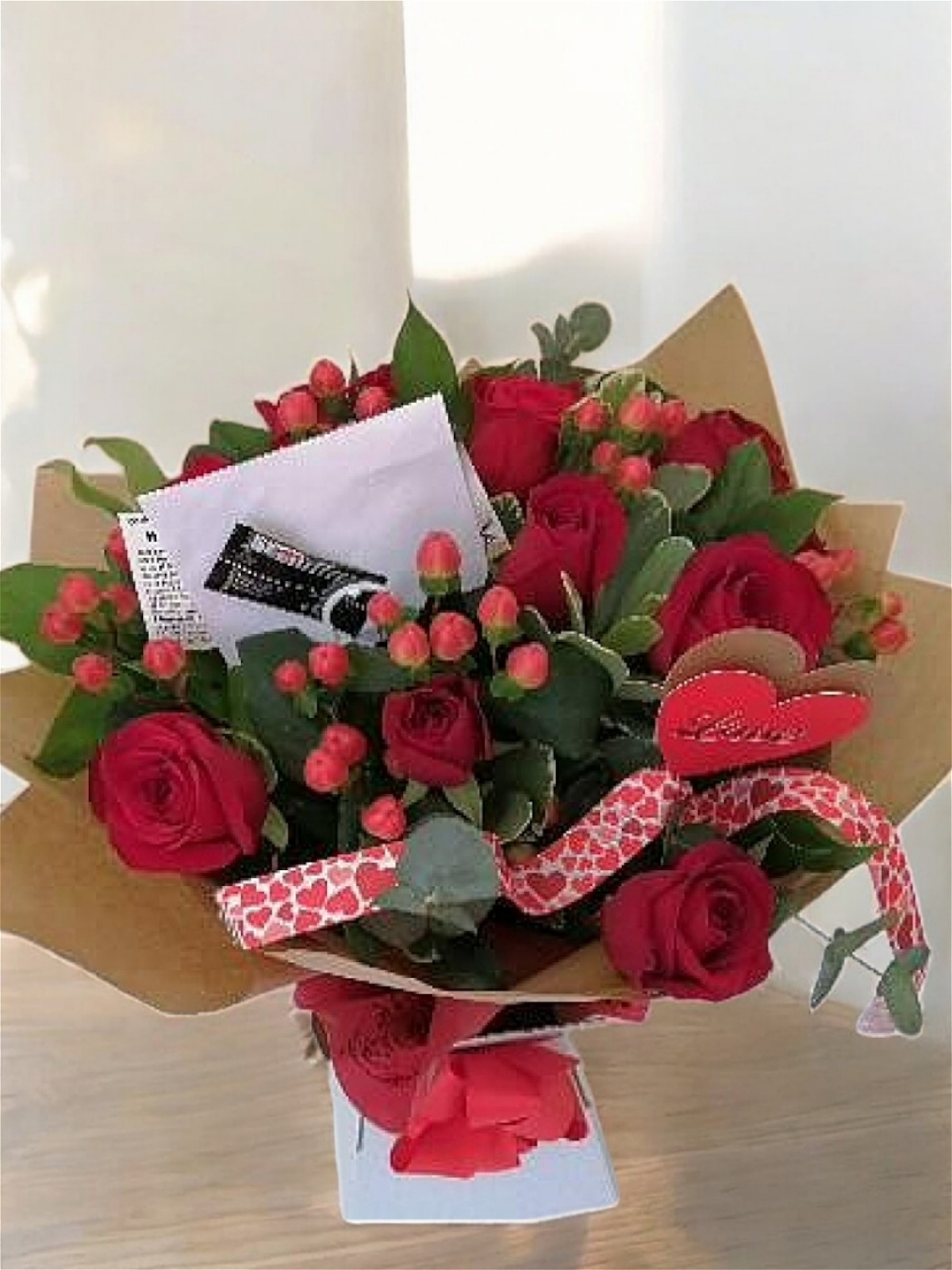 A stunning arrangement of 9 Grade A 60cm velvety Red Naomi roses, expertly hand-tied and complemented with a beautiful mix of seasonal foliage.