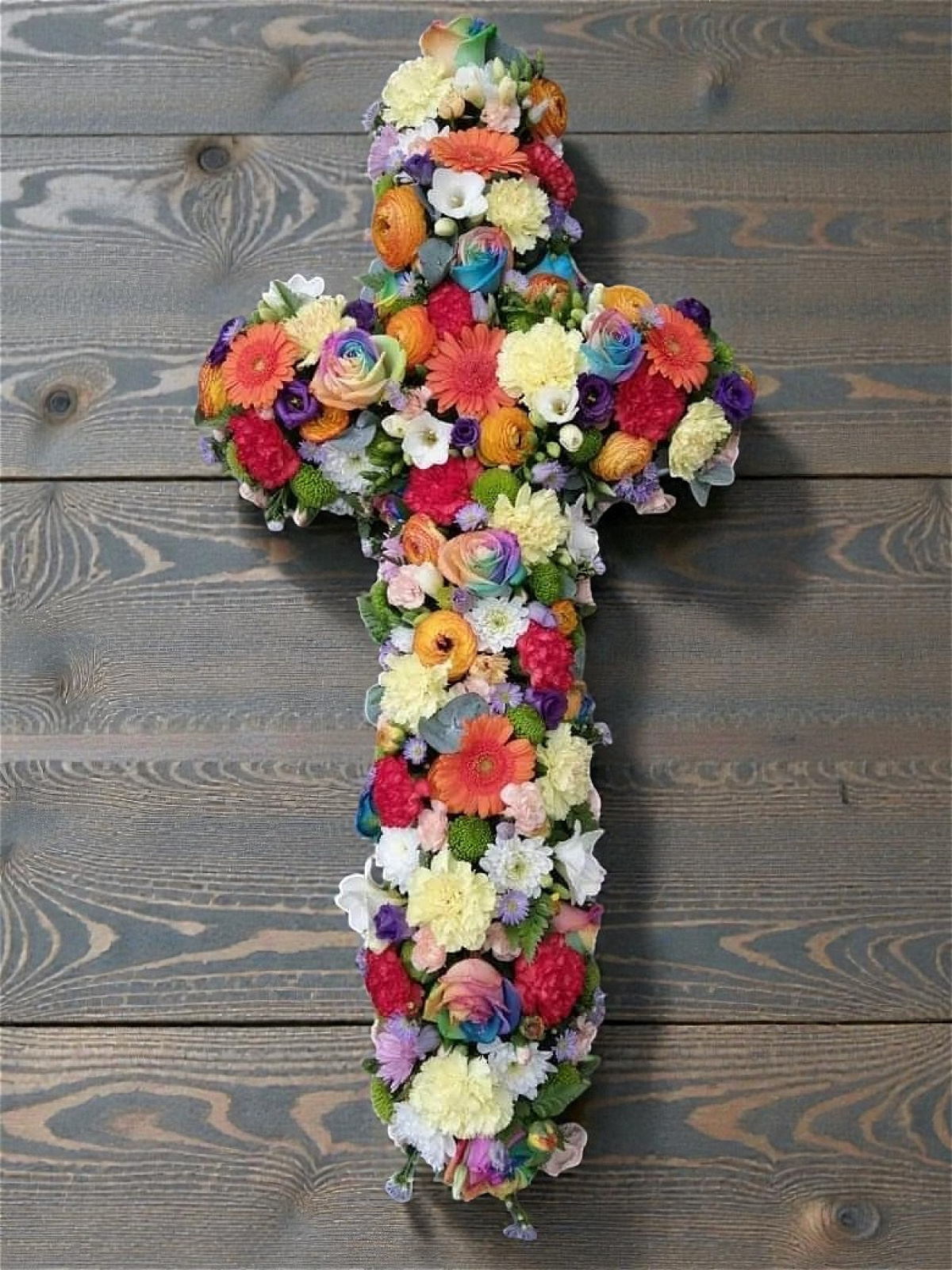 A loose cross of mixed flowers & foliage available in any colour or as pictures