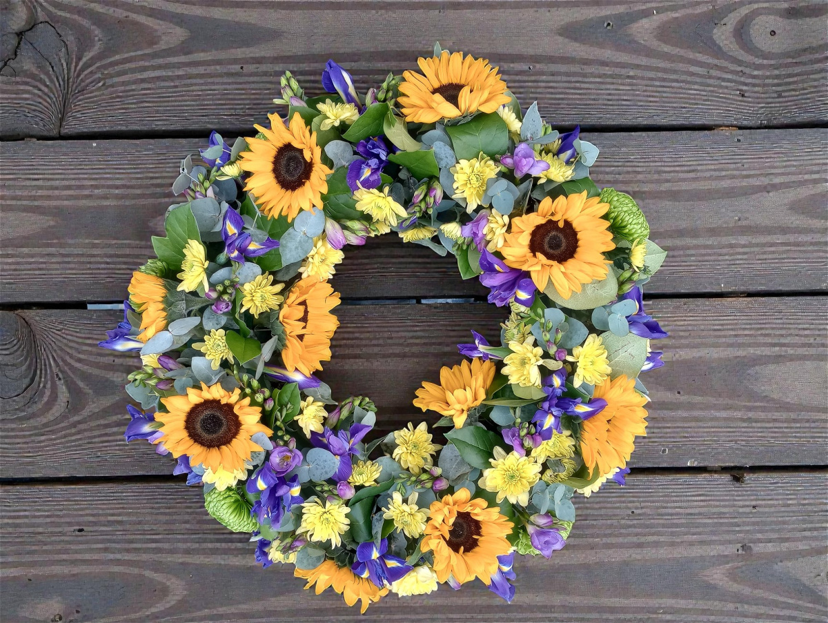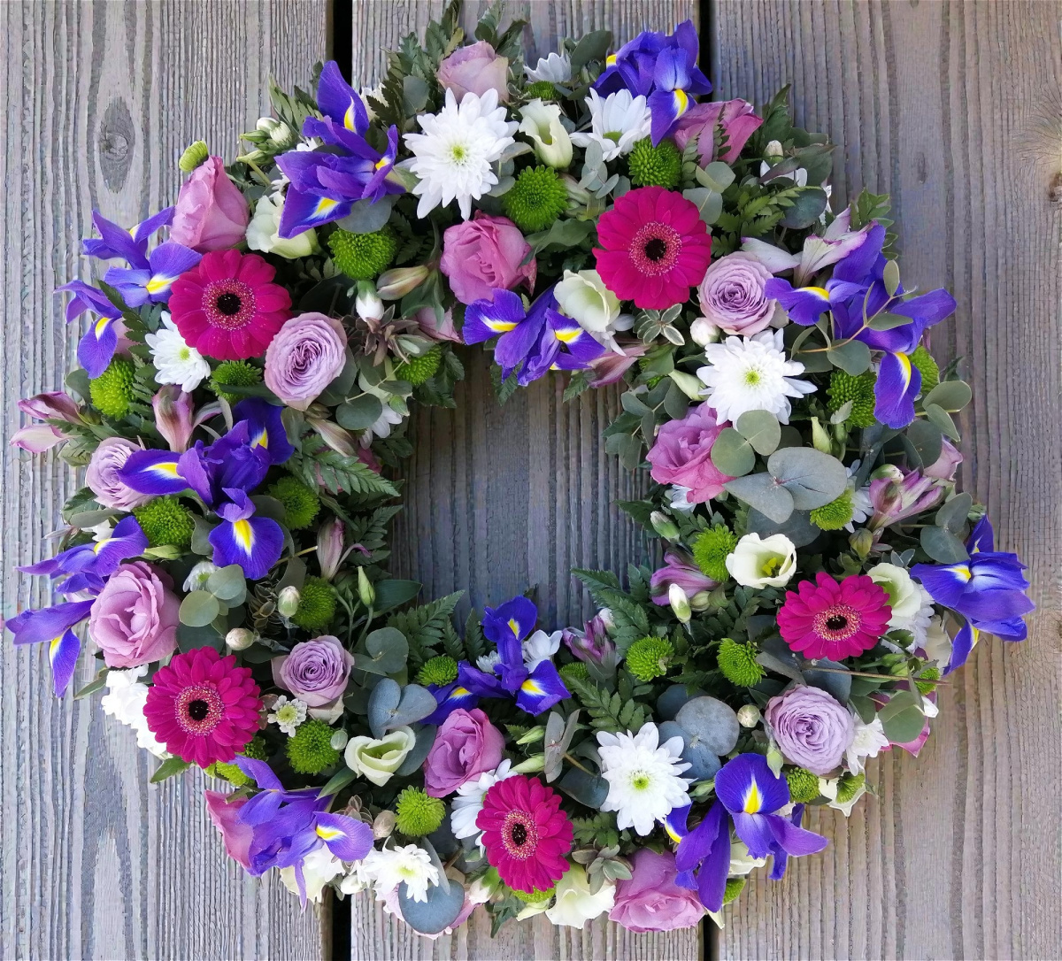A classic floral wreath beautifully crafted in pastel shades of pink, white, and purple. This elegant design features a delicate blend of chrysanthemums, roses, sweet peas, alstroemeria, and lisianthus, creating a soft and timeless tribute.