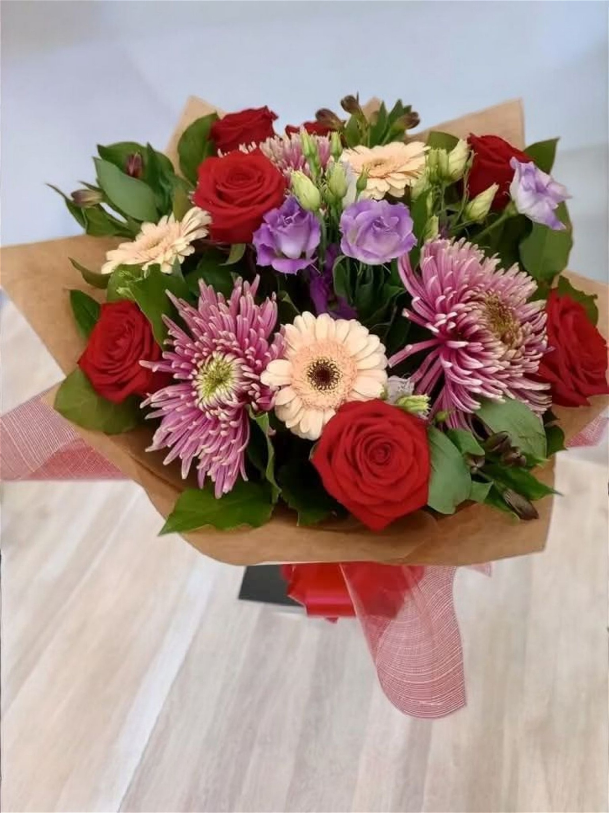Valentines mix flowers bouquet chrysanths blooms, lisianthus,roses, gerberas and mixed foliage